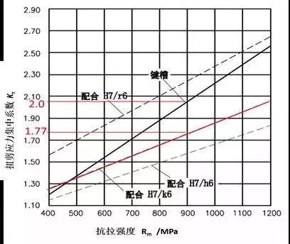 軸受純扭轉(zhuǎn)時(shí),鍵槽和配合邊緣處的有效應(yīng)力集中系數(shù)Kτ見(jiàn)圖7[1]所示。當(dāng)軸的抗拉強(qiáng)度Rm=900MPa時(shí),鍵槽的有效應(yīng)力集中系數(shù)Kτ=2。因此鍵槽對(duì)軸的削弱是很大的。